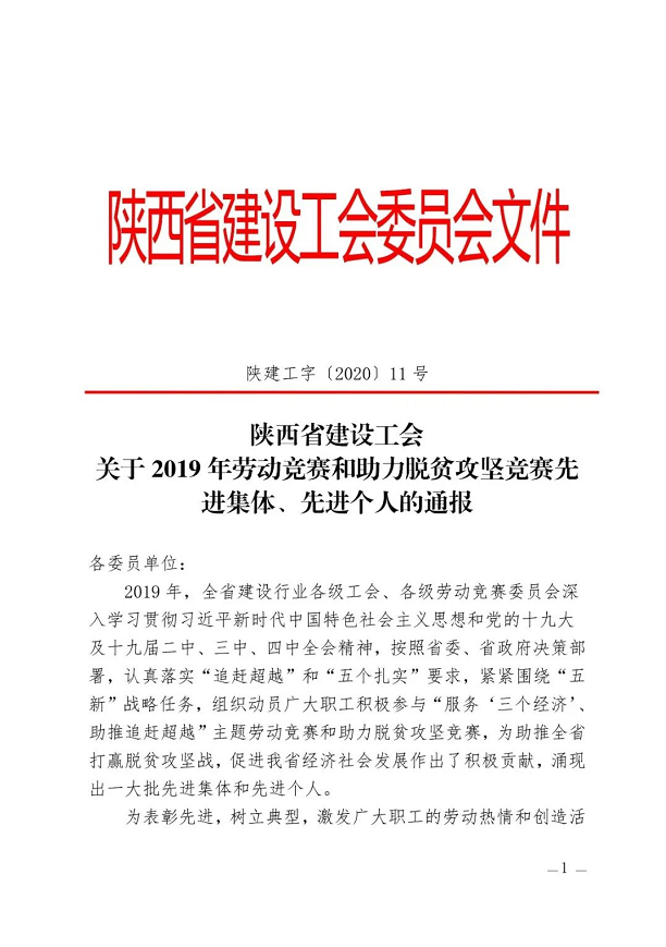 | 公司工會榮獲“陜西省建設系統(tǒng)勞動競賽先進集體”稱號 |