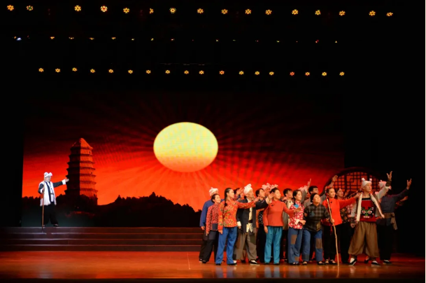 歌舞劇《南泥灣》以陜北青年腰鼓、窗花為男女主人公,通過安塞腰鼓、陜北說書、陜北民歌等典型黃土風(fēng)情文化元素,展示陜北元素,講述紅色故事,全方位、多角度地展現(xiàn)了上世紀(jì)4 0 年代初發(fā)生在南泥灣轟轟烈烈的大生產(chǎn)運動以及在大生產(chǎn)運動中產(chǎn)生的“自力更生、艱苦奮斗”的南泥灣精神,傳頌勞模精神、禮贊工匠精神、弘揚延安精神。