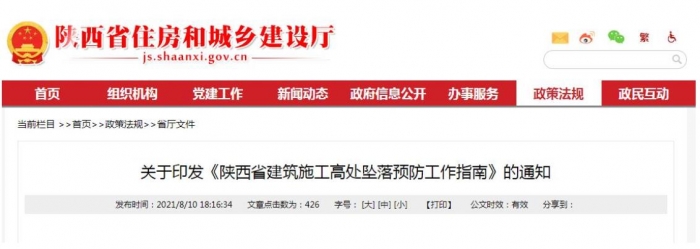 今年以來,全省建筑領(lǐng)域高墜事故多發(fā)。按照8月5日省安委會工作例會安排部署,為有效防范和遏制高處墜落事故發(fā)生,扎實做好住建領(lǐng)域安全生產(chǎn)工作,省廳制定了《陜西省建筑施工高處墜落預(yù)防工作指南》,現(xiàn)印發(fā)你們,請結(jié)合實際認真貫徹落實。