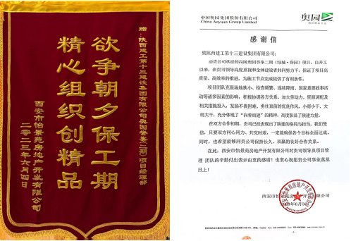 6月4日,陜西建工第十三建設(shè)集團(tuán)有限公司奧園譽(yù)峯(二期)項目收到來自建設(shè)單位西安怡景苑房地產(chǎn)開發(fā)有限公司發(fā)來的一封感謝信。